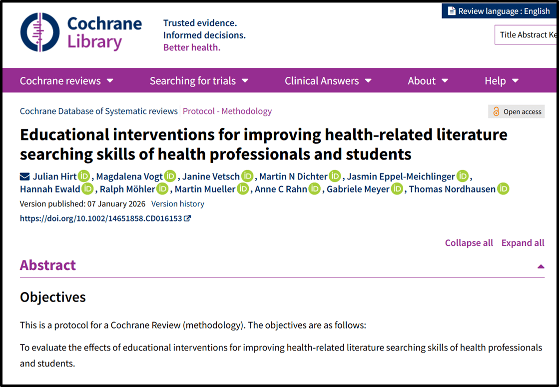 Hirt J, et al. Educational interventions for improving health-related literature searching skills of health professionals and students. Cochrane Database Syst Rev. 2026 Jan 7;1(1):CD016153. doi: 10.1002/14651858.CD016153. PMID: 41498627; PMCID: PMC12777918.