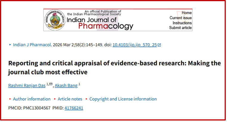 Das RR, Bang A. Reporting and critical appraisal of evidence-based research: Making the journal club most effective. Indian J Pharmacol. 2026 Mar 1;58(2):145-149. PMID: 41766241; PMCID: 13004567.