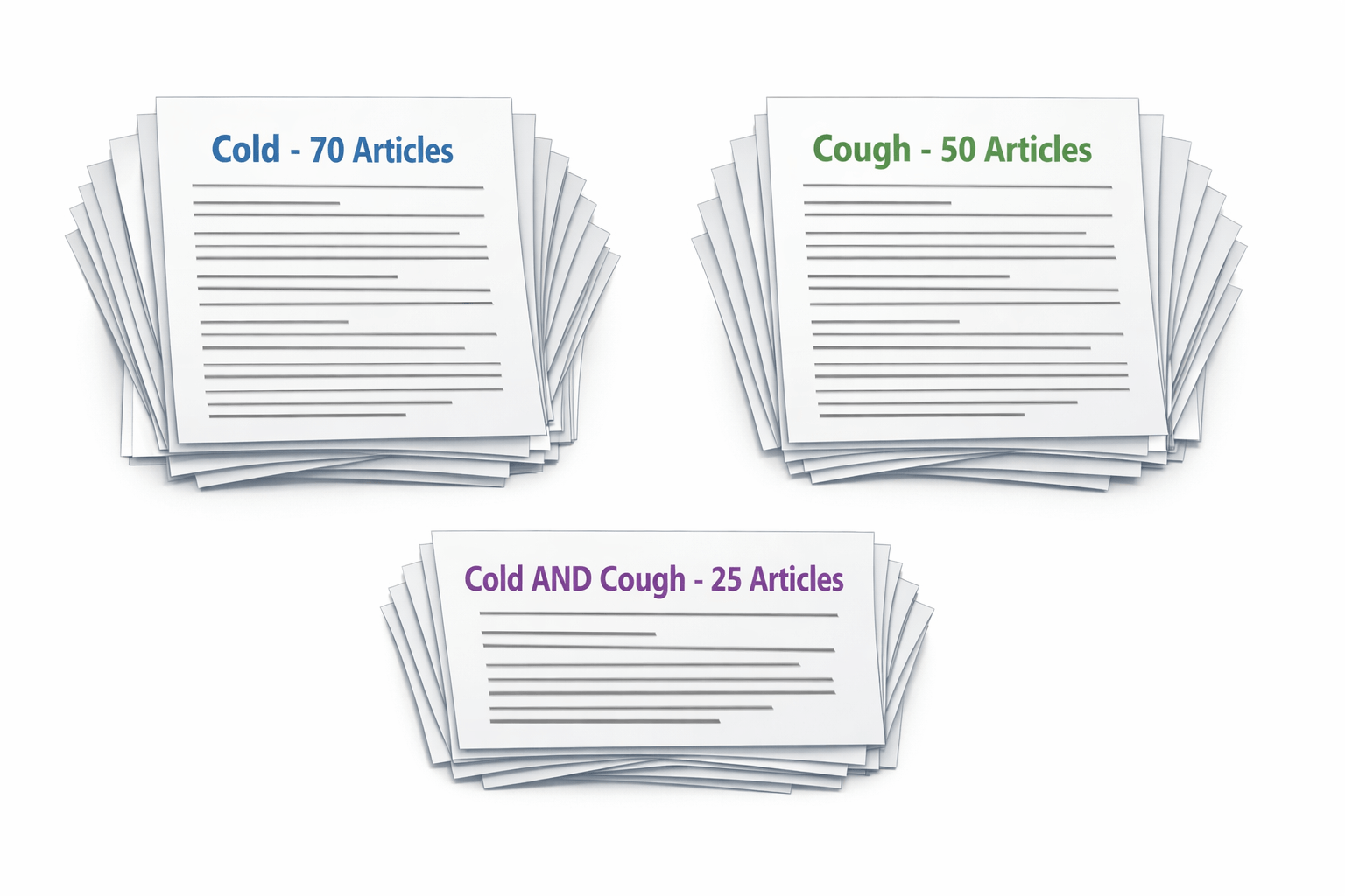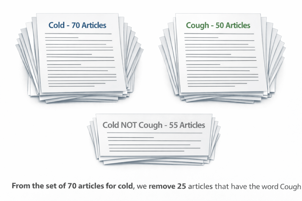 – Articles that contain the word cold. Inside this set – you do not want the ones that contain cough. - When you search using NOT – you get less “counts” That is easy!