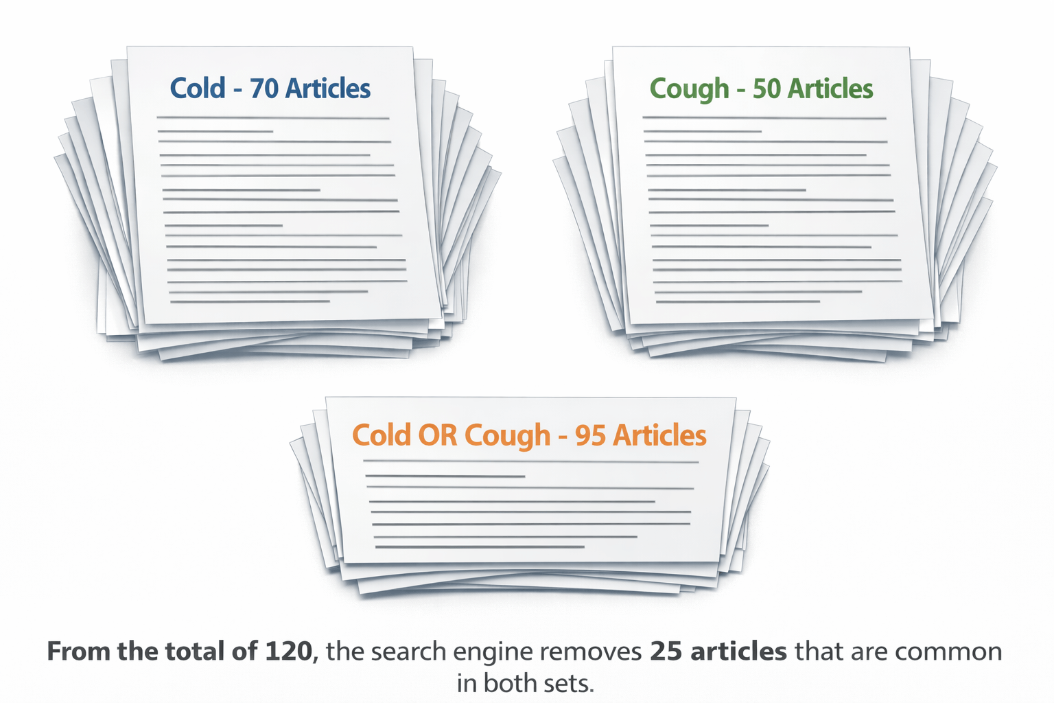 – Not for articles that contain only one of these - When you search using OR – you get more “counts”. That again is the opposite of how you think in English – where you get less results if you think of the word AND